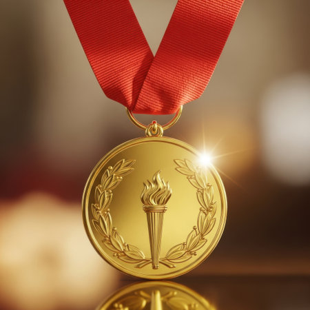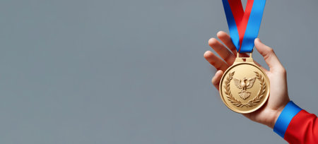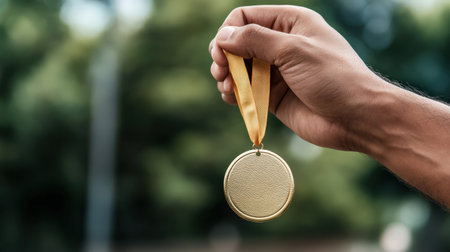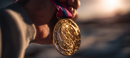 A detailed macro shot of a gold medal held by a hand, featuring a ribbon. The image captures sunlight reflections and cinematic shallow focus, highlighting sports achievement.
