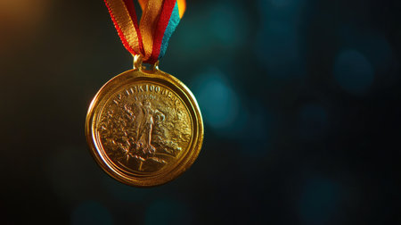 A gold medal dangles against a backdrop of shimmering light particles, symbolizing achievement, victory, and dedication in sports.