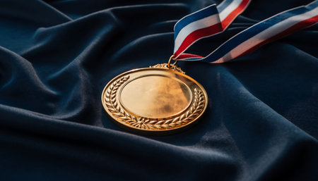 Shiny gold medal features a red, white, and blue ribbon, presented on elegant dark blue fabric with soft folds