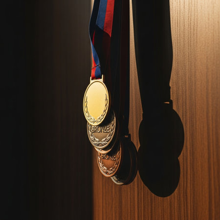 A closeup reveals shiny medals set against a dark blackboard, symbolizing the intersection of success and innovation.
