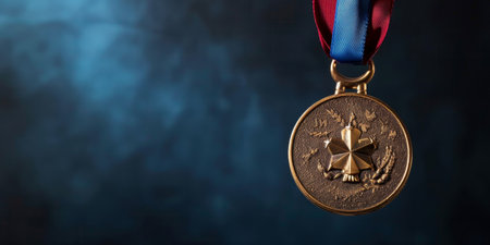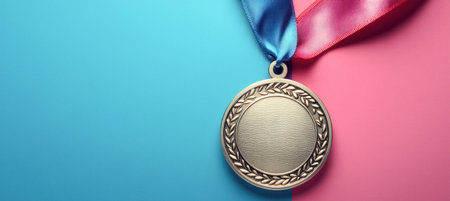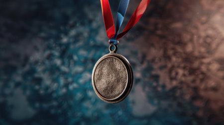 Shiny medal with textured surface hangs from red and blue ribbon, symbolizing achievement and recognition. background features blurred, colorful gradient, enhancing medal prominence