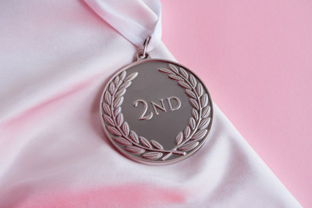 Close-up of a silver 2nd place medal hanging on a pink ribbon against a soft pink background.