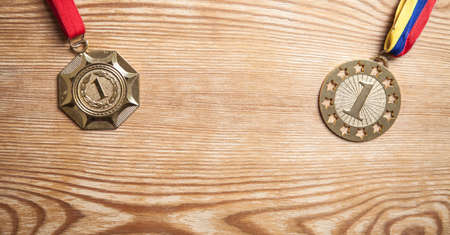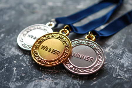 Three medals of different colors on table symbolizing achievements in sports with a sign Winner
