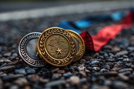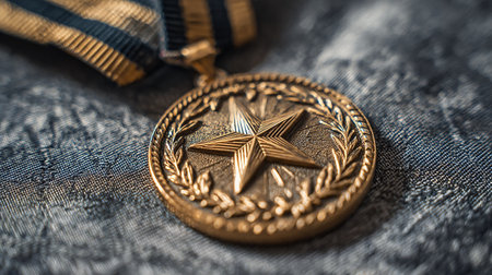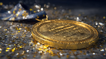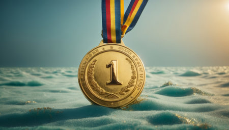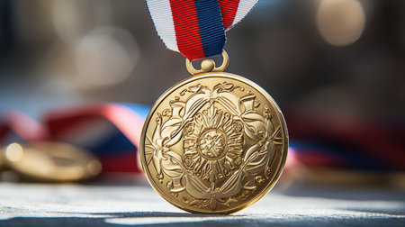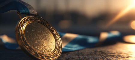 Detailed macro shot of a gold medal with a ribbon, showcasing sunlight reflections and shallow focus. The image captures the essence of sports achievement and realism.