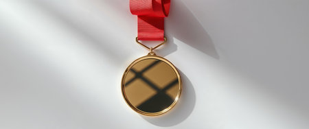 A golden medal, featuring a star, is suspended from a red ribbon against a soft gray backdrop. The image utilizes a simple, clean style with smooth textures and focused lighting to emphasize the object. The composition is straightforward, suitable for presentations or illustrative commercial projects.