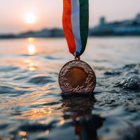 Macro shot of a medal edge shining under sunlight, showcasing intricate details and a warm, victorious tone. The cinematic composition highlights the texture and craftsmanship.