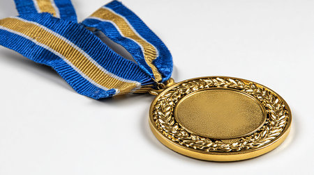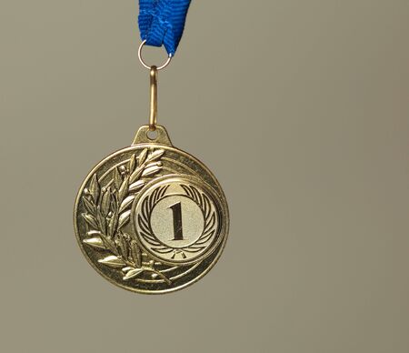 Close-up of a gold medal with blue ribbon on a blurred background. Concept of victory, achievement, and excellence in sports or academics. Award and recognition background.