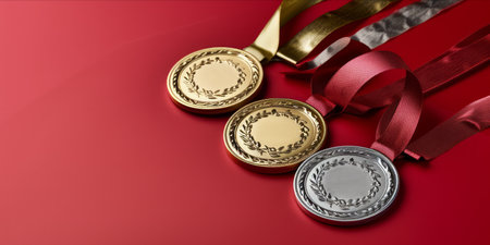 A set of gold, silver, and bronze medals with ribbons on a red background.