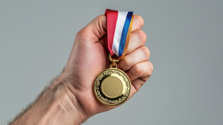 A close-up view of a hand holding a gold medal with a colorful ribbon, symbolizing achievement and success. Ideal for celebrating accomplishments and recognition.