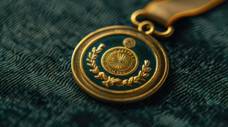 embossed gold medal on dark green, symbolizing achievement and excellence in a prestigious competition.