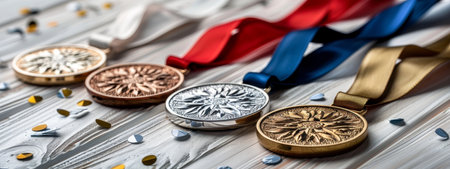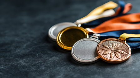 Five medals with various metallic finishes hang on colorful ribbons against a textured background. The composition features close-up details, showcasing the circular designs and textures. The lighting highlights the metallic surfaces. Suitable for use in presentations about achievement, awards, or success, this image has commercial application.