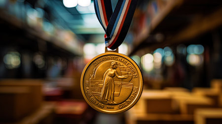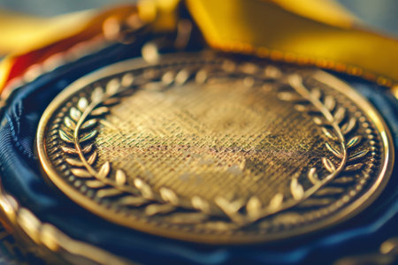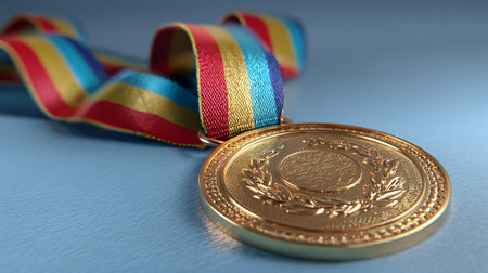 Close-up view of a shiny gold medal adorned with a colorful ribbon, representing achievement and victory in various competitions, symbolizing success and honor.