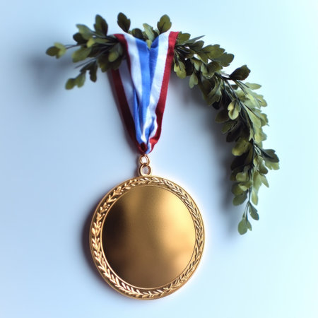 Close-up of a gold medal with a laurel wreath design, symbolizing victory and achievement.