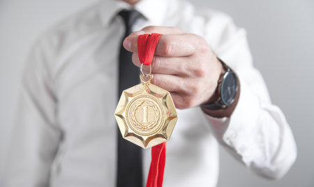 The image features a gold medal with the number one prominently displayed on it. The medal is held by a hand and has a red and white ribbon attached. The entire scene is set against a white background.