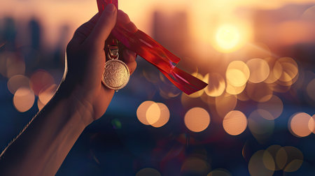 A detailed macro shot of a gold medal held by a hand, featuring a ribbon. The image captures sunlight reflections and cinematic shallow focus, highlighting sports achievement.