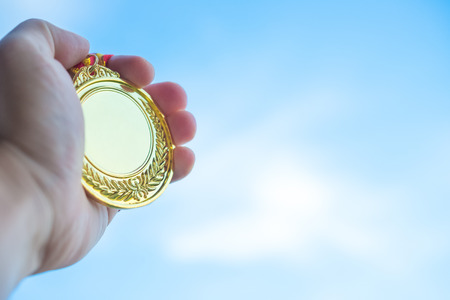 Win ,be a champion. Striving for achievements, concept, a female hand squeezes the winners gold medal, blue background