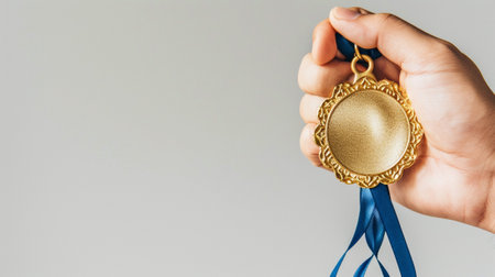 A close-up captures a golden medal resting in an open human palm. The medal displays a textured surface and is attached to a white and gold ribbon. The image features neutral lighting and a shallow depth of field. This composition could be suitable for themes of achievement, success, or recognition and for various commercial projects.