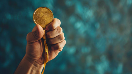 hand holding up a gold trophy medal as a winner in a competition