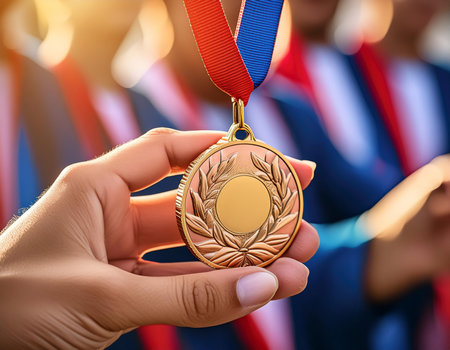 Cinematic sports photography capturing hands holding gold and bronze medals in bright sunlight. The image conveys detailed realism and emotional celebration with vibrant tones.