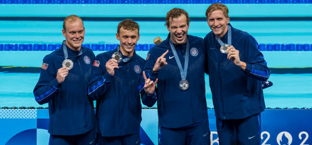 Luke Hobson (USA), Kieran Smith (USA), Carson Foster (USA), and Drew Kibler (USA) celebrate after winning the Silver medal in the Men's 4 X 200m Freestyle Relay at the Paris La Defense Arena during the 2024 Paris Summer Olympics in Paris, France.