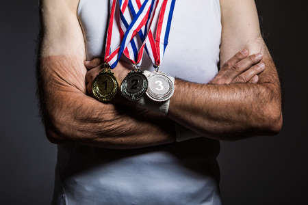 Arm of elderly athlete holding three gold, silver and bronze medals on a dark background. Sports and victory concept.