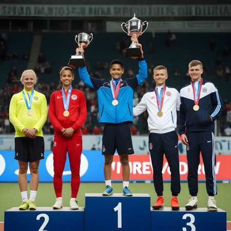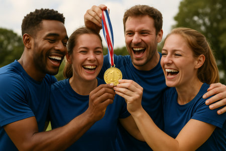 A group of athletes joyfully display their medals after a competition, basking in golden sunlight. The blurred background and cinematic tone enhance the emotional energy of the moment.
