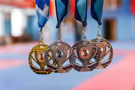 medals, gold, silver, and bronze on a blurred background.