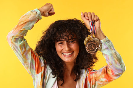 Happy winner showing different medals on yellow background