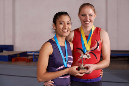 Talent wins games, teamwork wins championships. Portrait of two young medalists holding a trophy together.