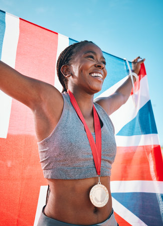 Exercise, winning and black woman with celebration, UK flag and sports with competition, achievement and champion. African person, athlete or winner with British symbol, pride and medal for victory