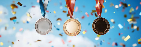 Three blank, gleaming medals in bronze, silver, and gold, surrounded by flying confetti and a radiant sky, conveying a joyful, luminous design perfect for victory and ceremony imagery, banner