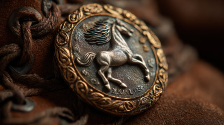 Close-up view of a detailed horse emblem affixed to a leather item, highlighting the craftsmanship and artistry involved in its creation.
