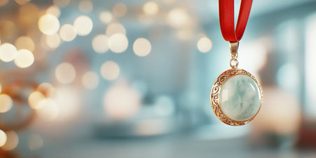 Stunning gold pendant featuring a blue stone, elegantly suspended by a red ribbon. soft focus background enhances the intricate design, adding sophistication and charm.