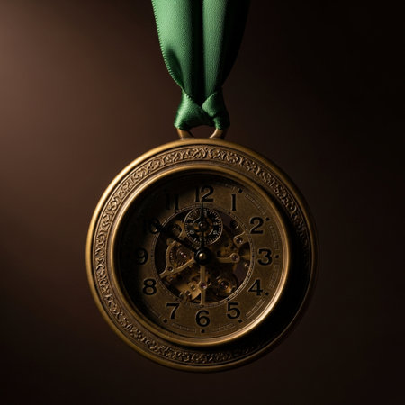 Vintage pocket watch on a dark background with a green ribbon.