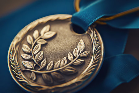 Macro shot capturing the intricate texture of an engraved medal, bathed in soft sunlight. The shallow depth of field highlights the storytelling detail of victory.