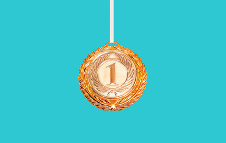 Sports award gold medal, champion first place, number one, prize of winner athlete isolated on blue background