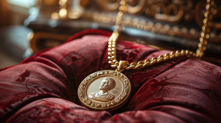 gold chain with a medallion lies on a red velvet pillow.