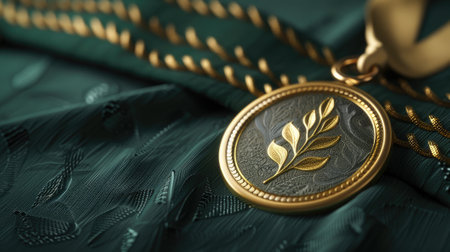embossed gold medal on dark green, symbolizing achievement and excellence in a prestigious competition.