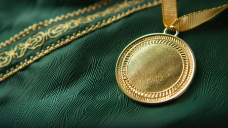 A beautiful gold medal elegantly suspended from a rope necklace, showcasing its textured surface and soft lighting against a dark background, symbolizing achievement and honor.