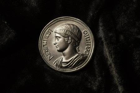 A beautifully engraved coin reveals a regal figure, showcasing intricate designs and textures. Soft light illuminates the metallic surface, highlighting artistry and historical significance.
