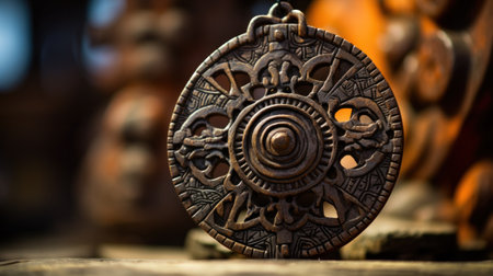 Close-up view of beautifully engraved medallions displaying detailed cultural symbols, showcasing craftsmanship. The background appears solid, enhancing the medallions' shine and beauty.