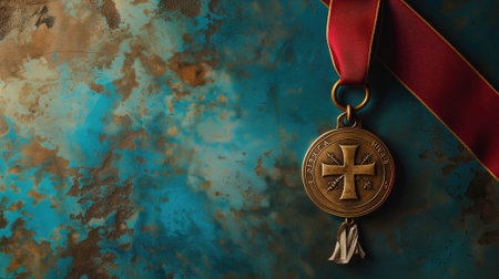 Medal with a cross on a red ribbon against a blue rusted background