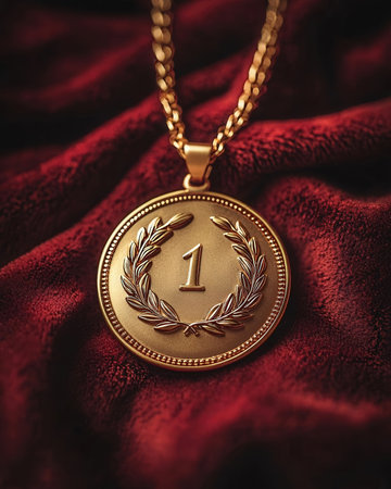A golden medal with intricate designs hangs from a ribbon against a backdrop of fluffy clouds. The late afternoon light enhances the shiny surface, representing triumph and honor.
