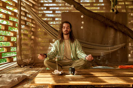 Bearded man in linen pants and shirt meditating in lotus position trying to relax after stressful day