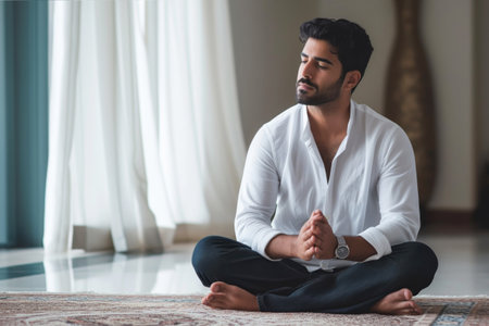 A Southeast Asian man meditating in a peaceful, contemplative pose.