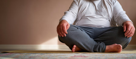 A man with long hair and glasses sitting in a meditation position. Generative AI image.