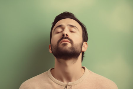Young man with closed eyes on green background. Toned image.