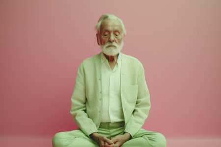 Portrait of a senior man sitting in lotus position against pink background