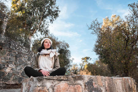 A young tourist Woman enjoying sunset over sea mountain landscape while sitting outdoor. Womens yoga fitness routine. Healthy lifestyle, harmony and meditation