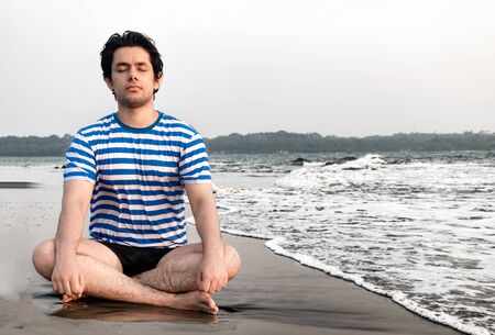 Handsome good looking boy in his early 20s, is meditating for physical and mental well being, while sitting in lotus position on beach. Concept of health, yoga, well being, lifestyle, relaxation etc..